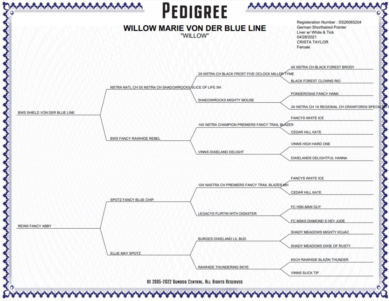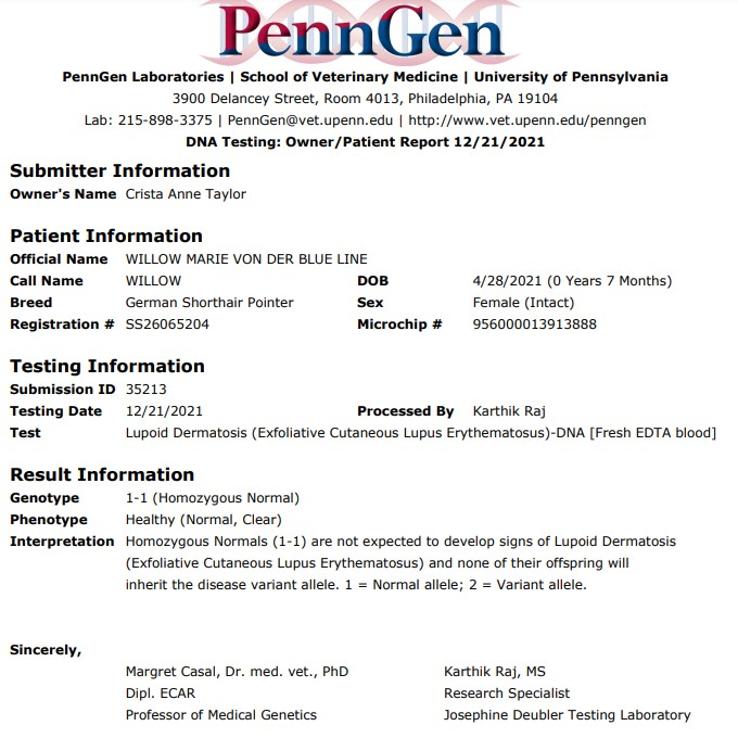 She is also PennGen tested and CLEAR for Lupoid Dermatosis (LD) — a vital genetic test specific to the German Shorthaired Pointer breed.