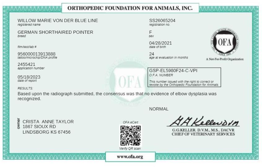 Willow is OFA Certified for both hips and elbows, ensuring excellent joint health and structure.