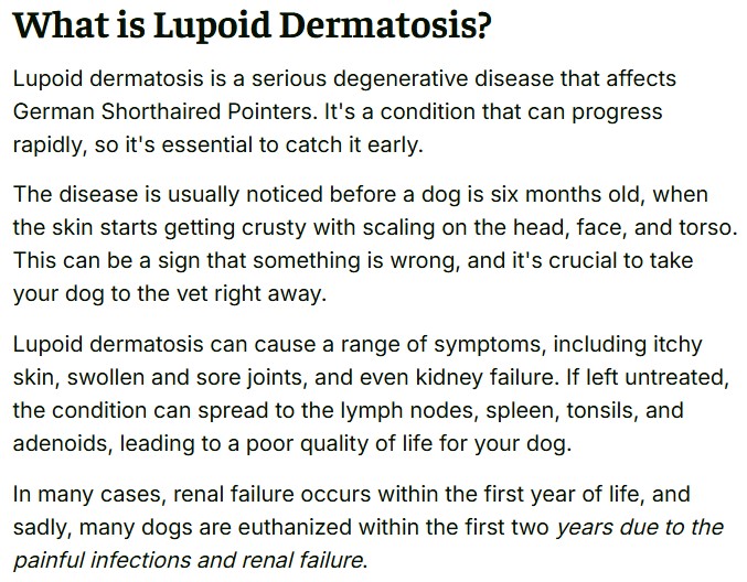 We also submit blood samples to the University of Pennsylvania for testing of Lupoid Dermatosis (LD) — a serious condition known to affect the German Shorthaired Pointer breed.