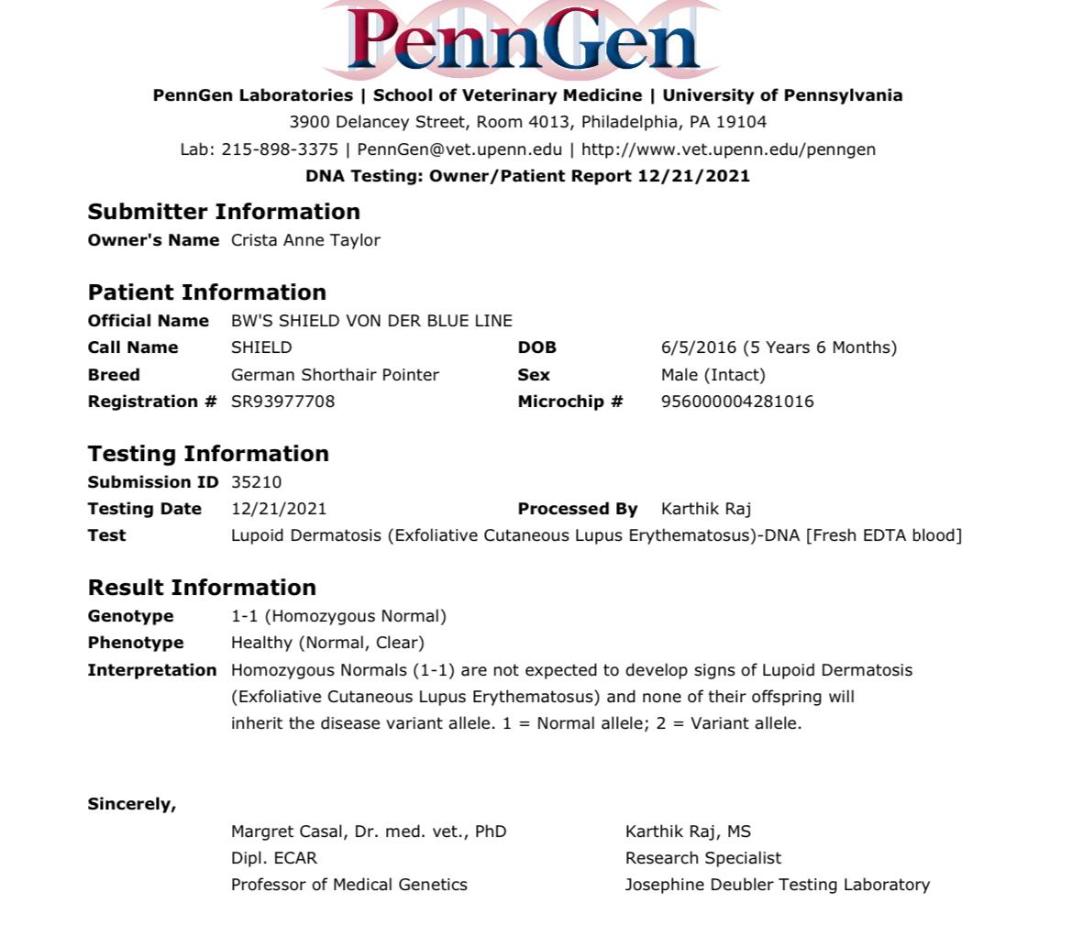 In 2021, Shield was also tested through PennGen for Lupoid Dermatosis (LD) and was confirmed CLEAR.