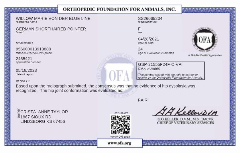 Willow is OFA Certified for both hips and elbows, ensuring excellent joint health and structure.